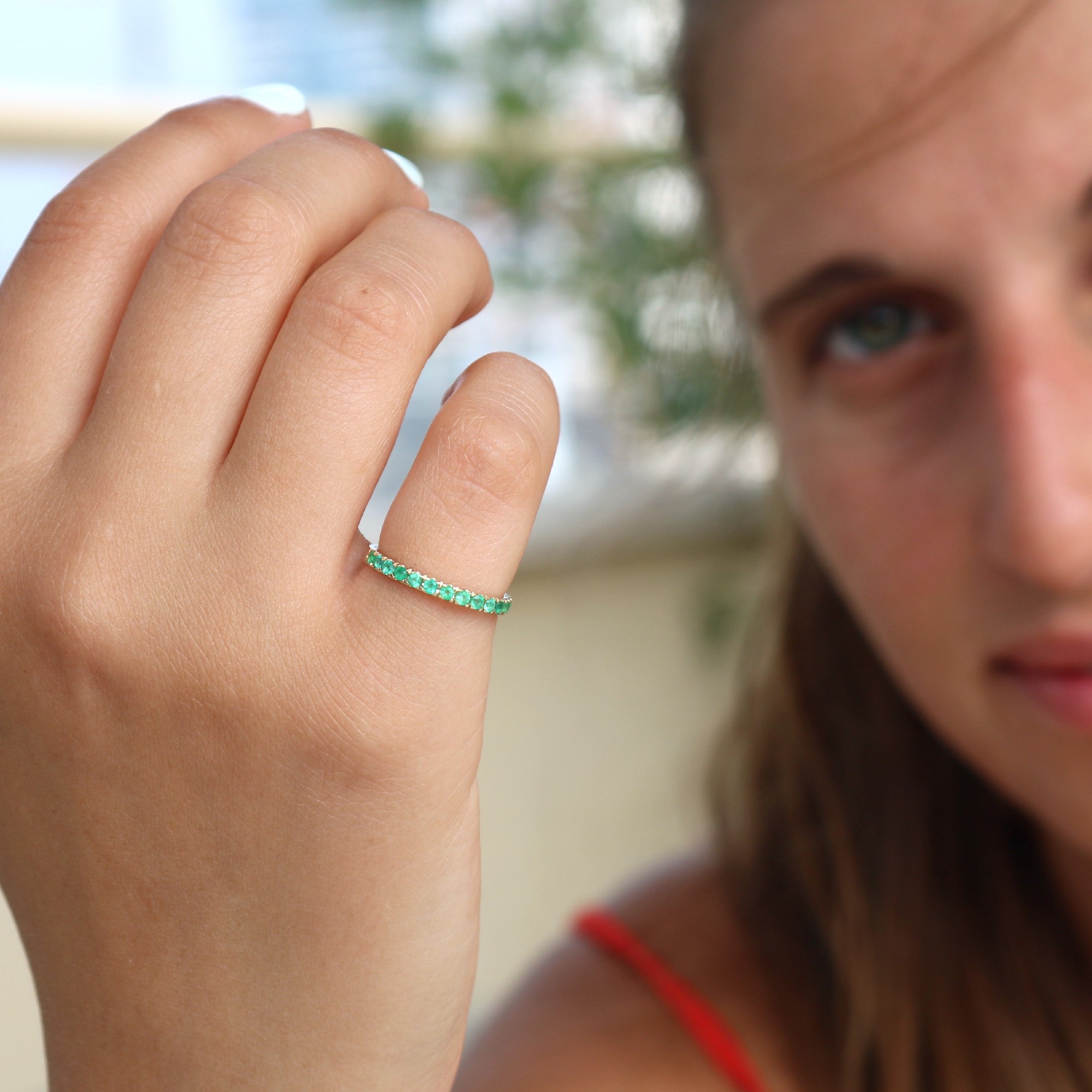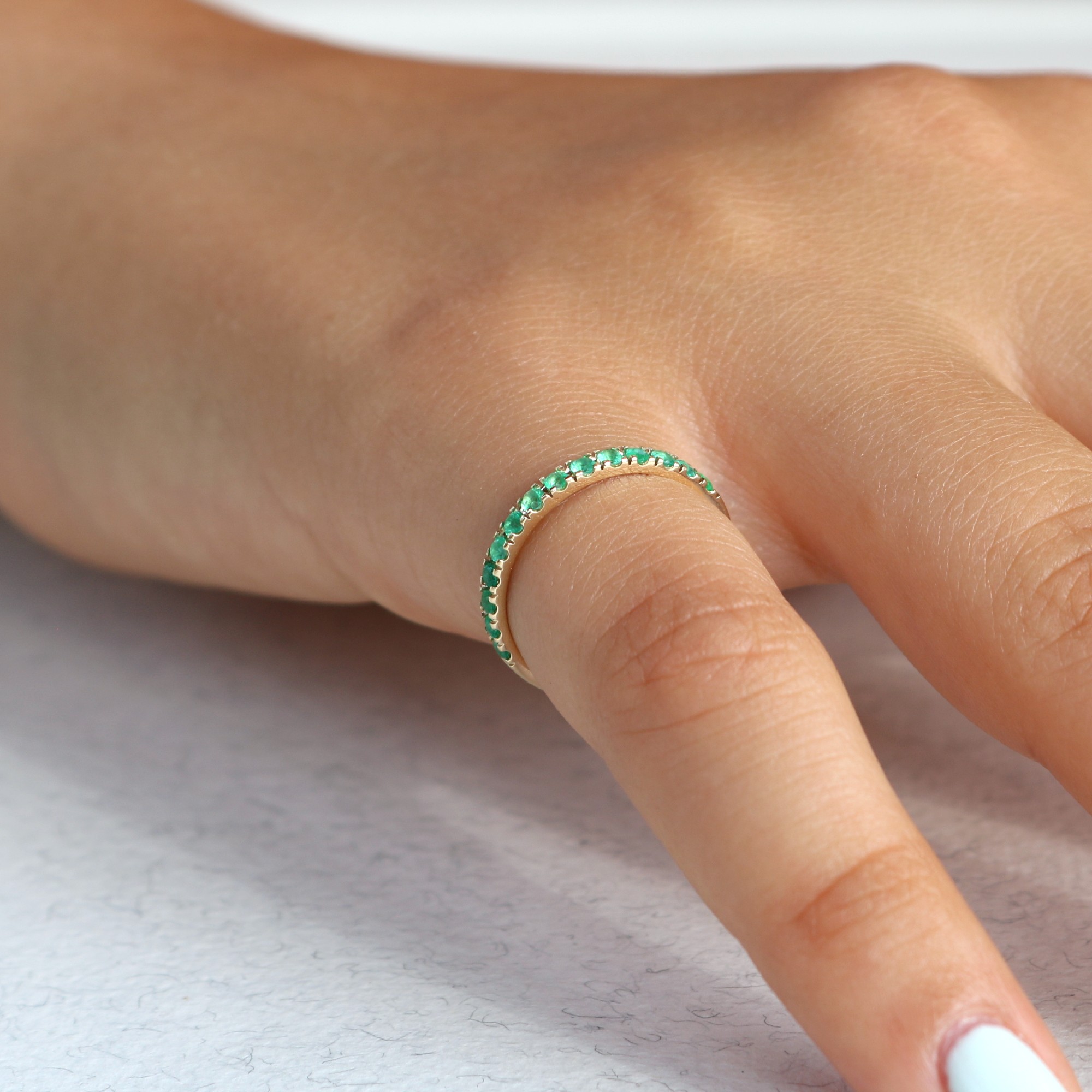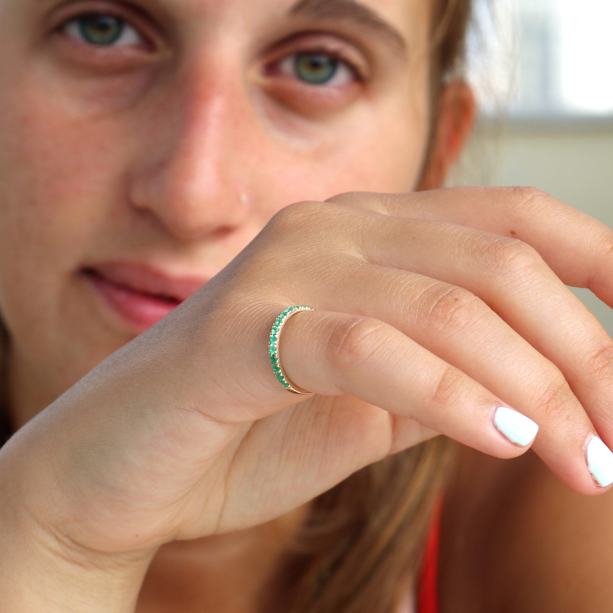 | טבעת איטרניטי חצי בזהב צהוב 14K, משובצת אמרלד . |