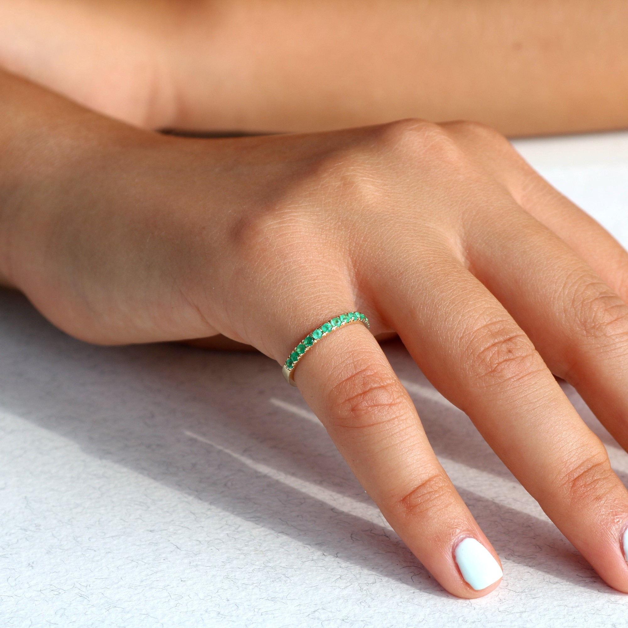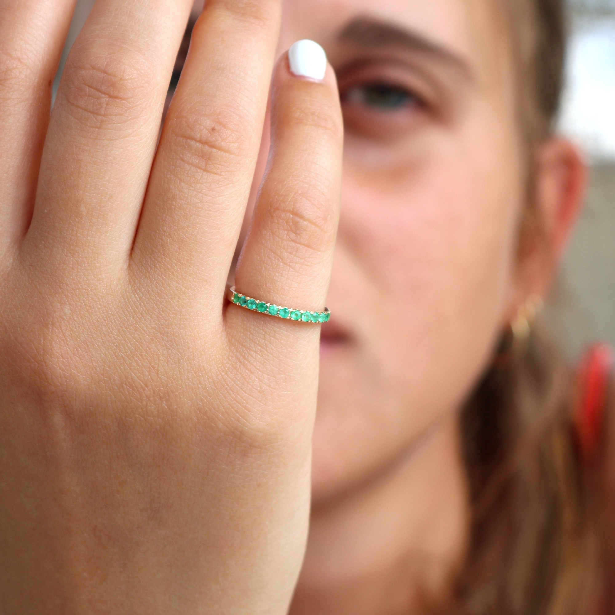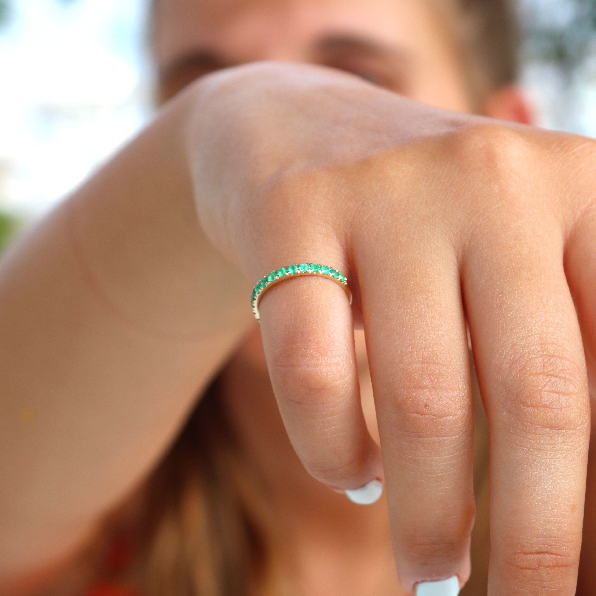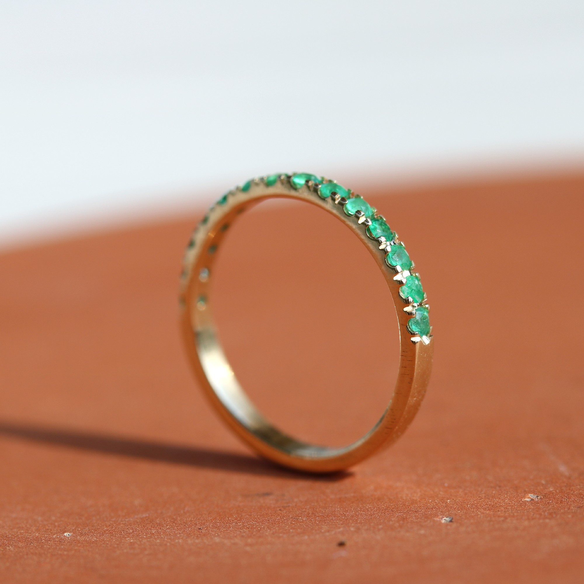 | טבעת איטרניטי חצי בזהב צהוב 14K, משובצת אמרלד . |