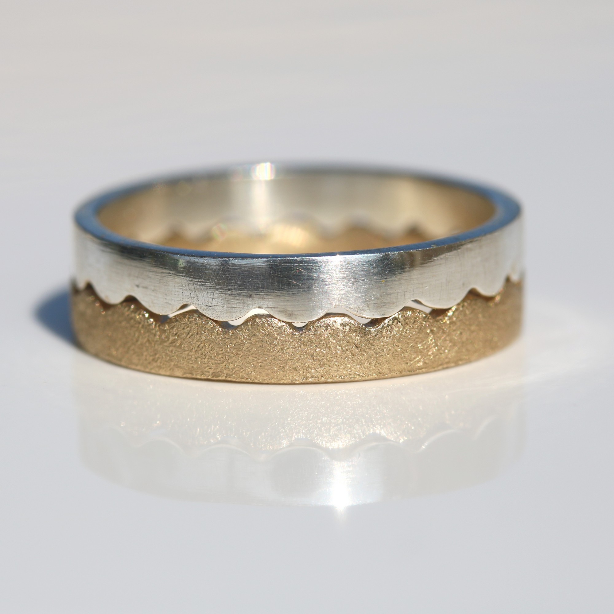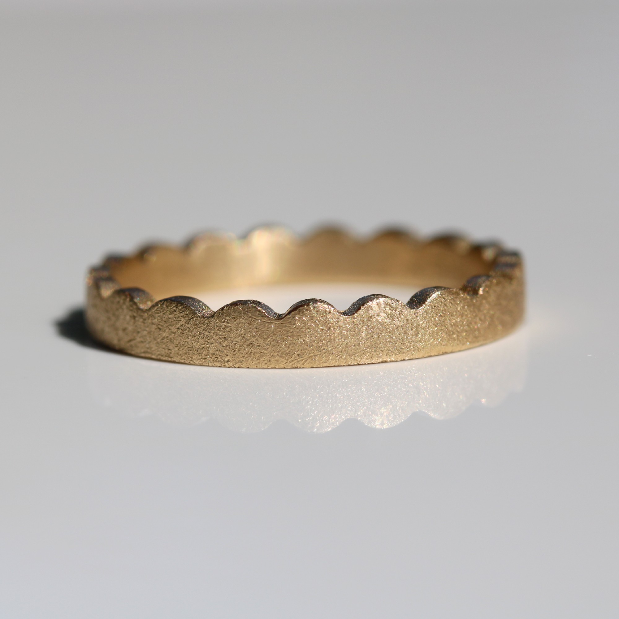 | טבעת בזהב צהוב 14K בגימור מט חול, צד אחד ישר וצד שני גלי. |