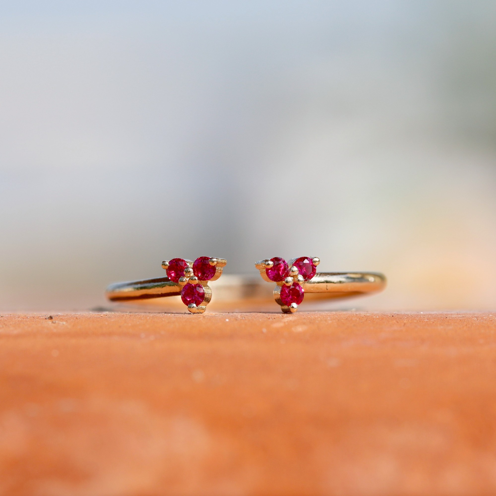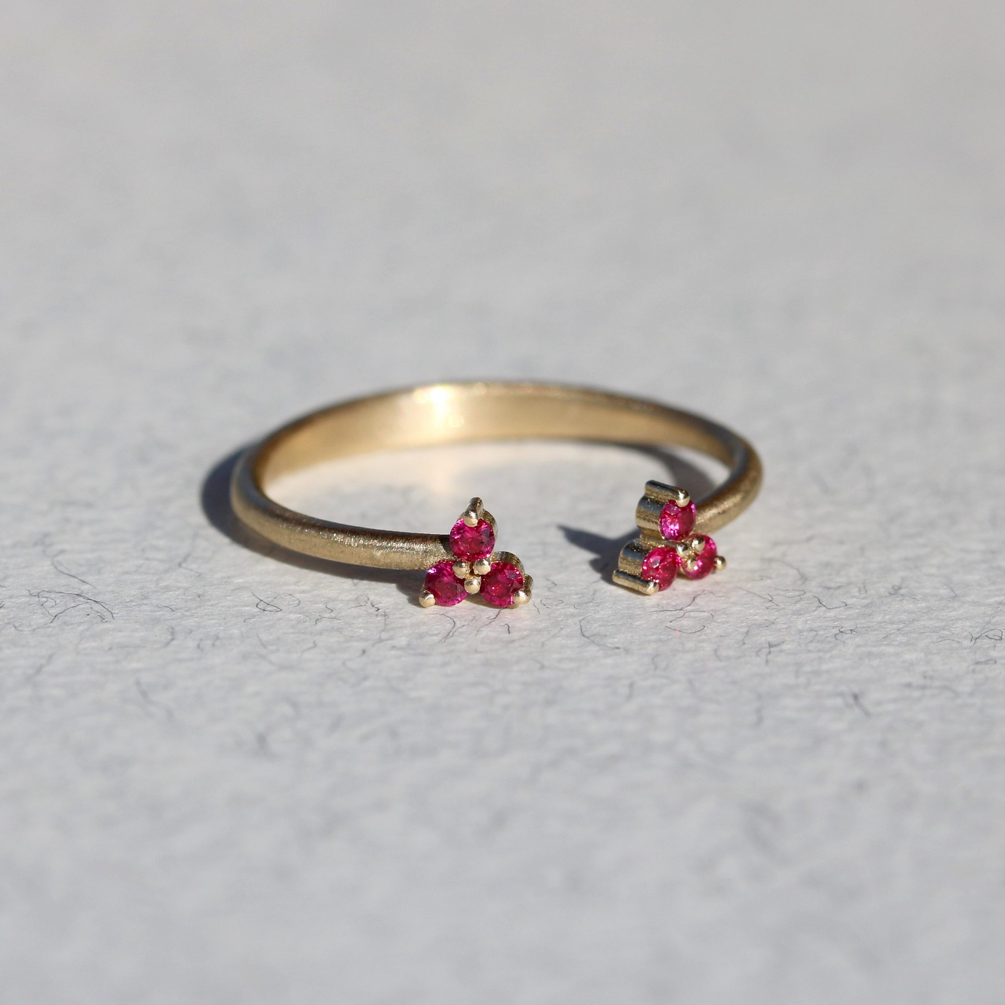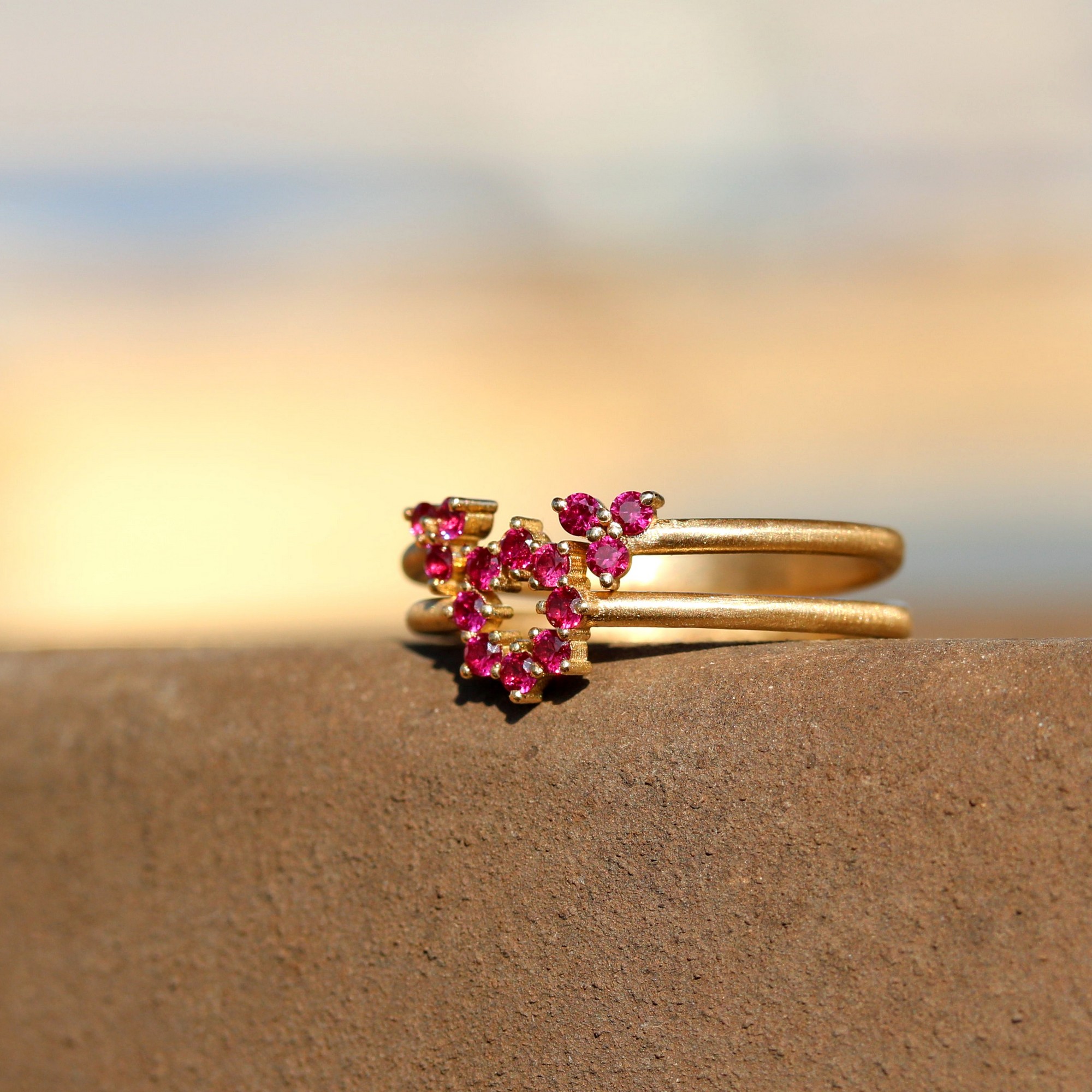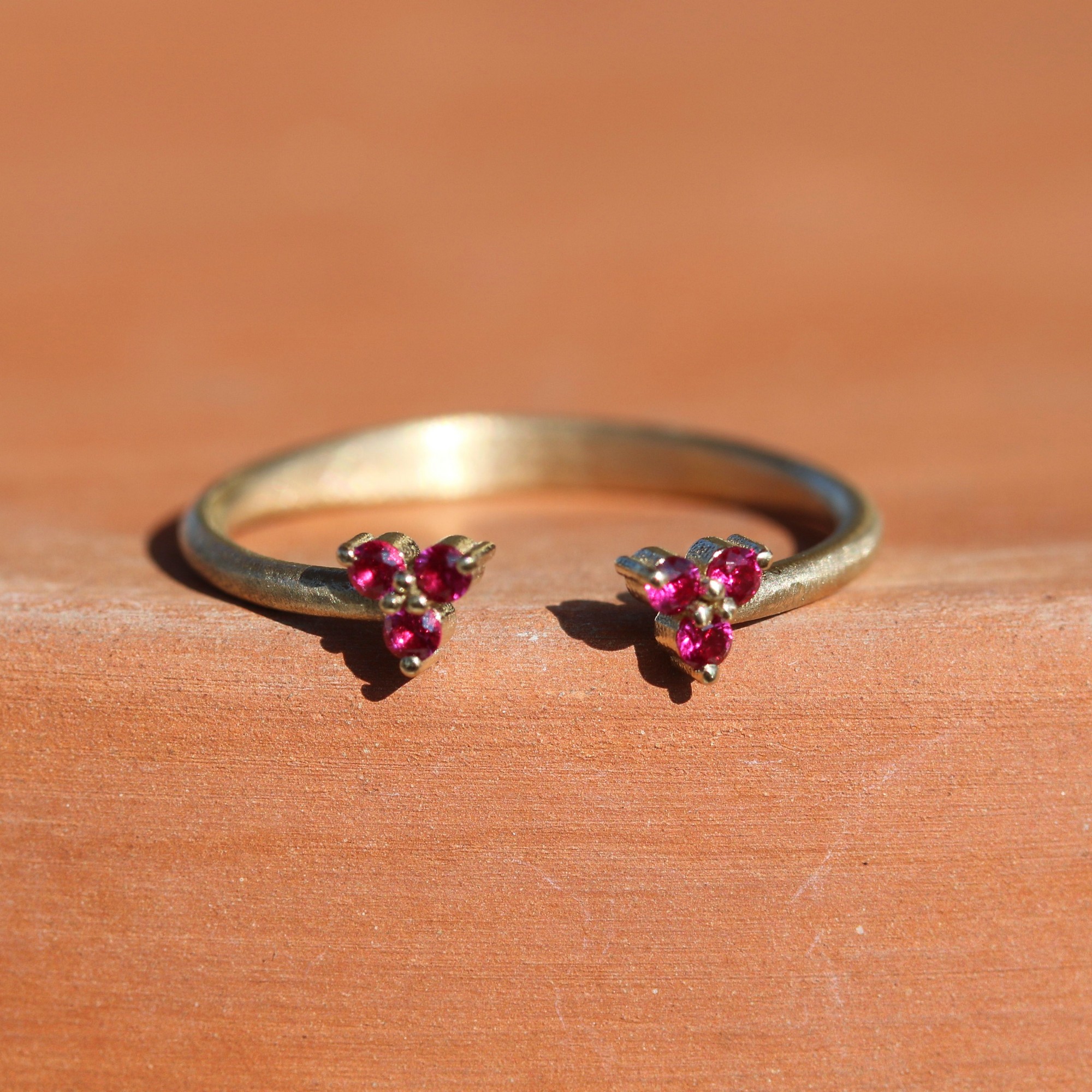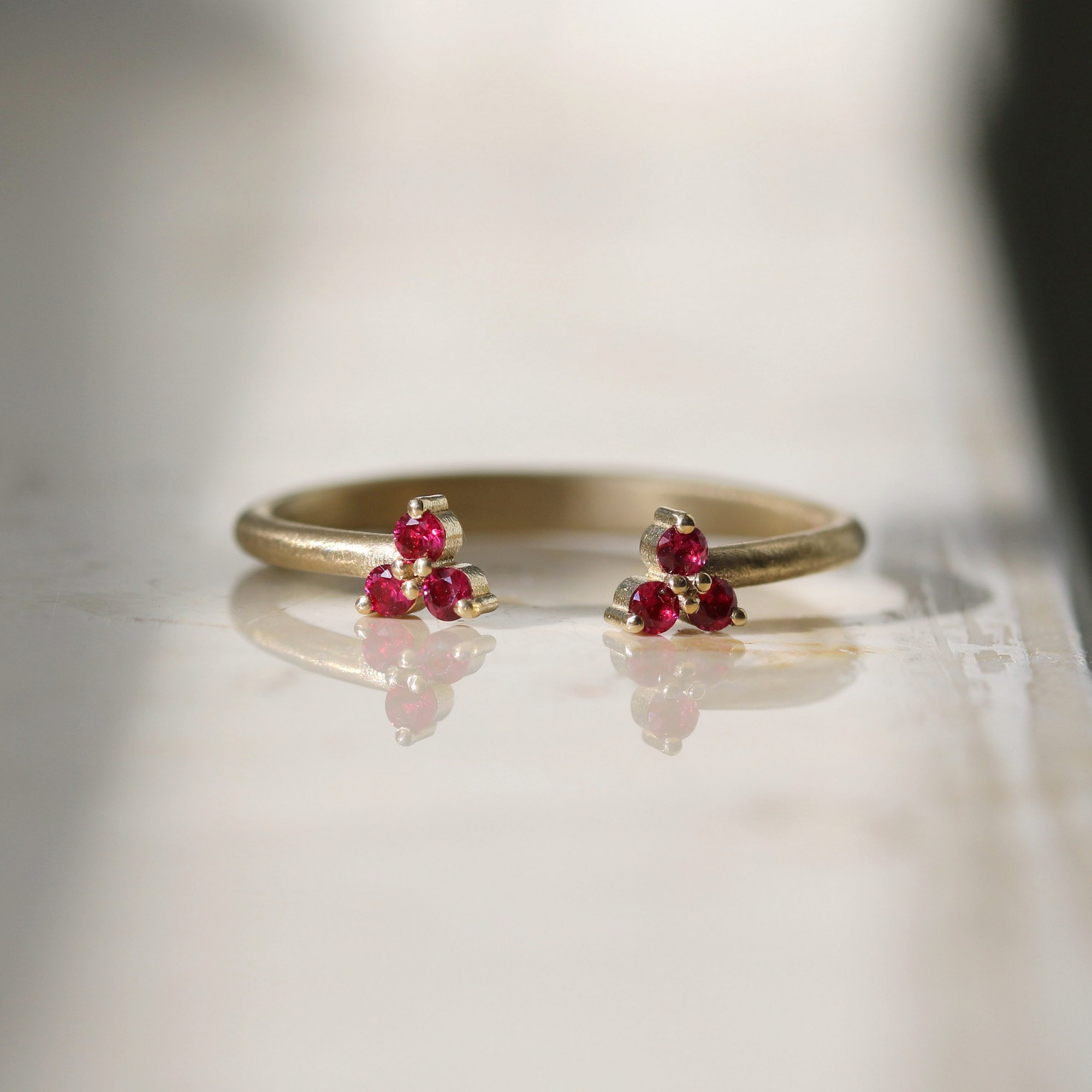 | טבעת בזהב צהוב 14K בגימור מט משובצת אבני רובי . |