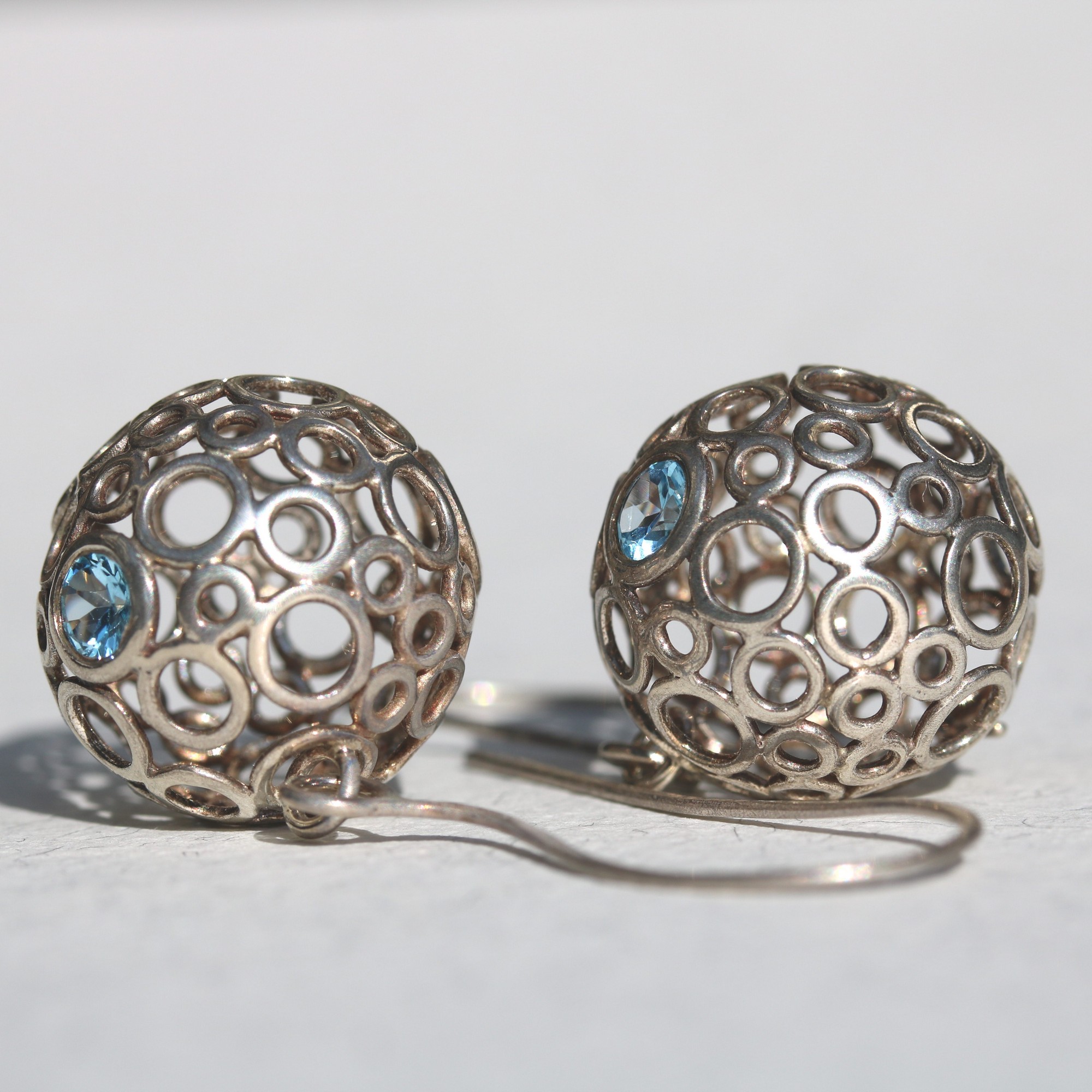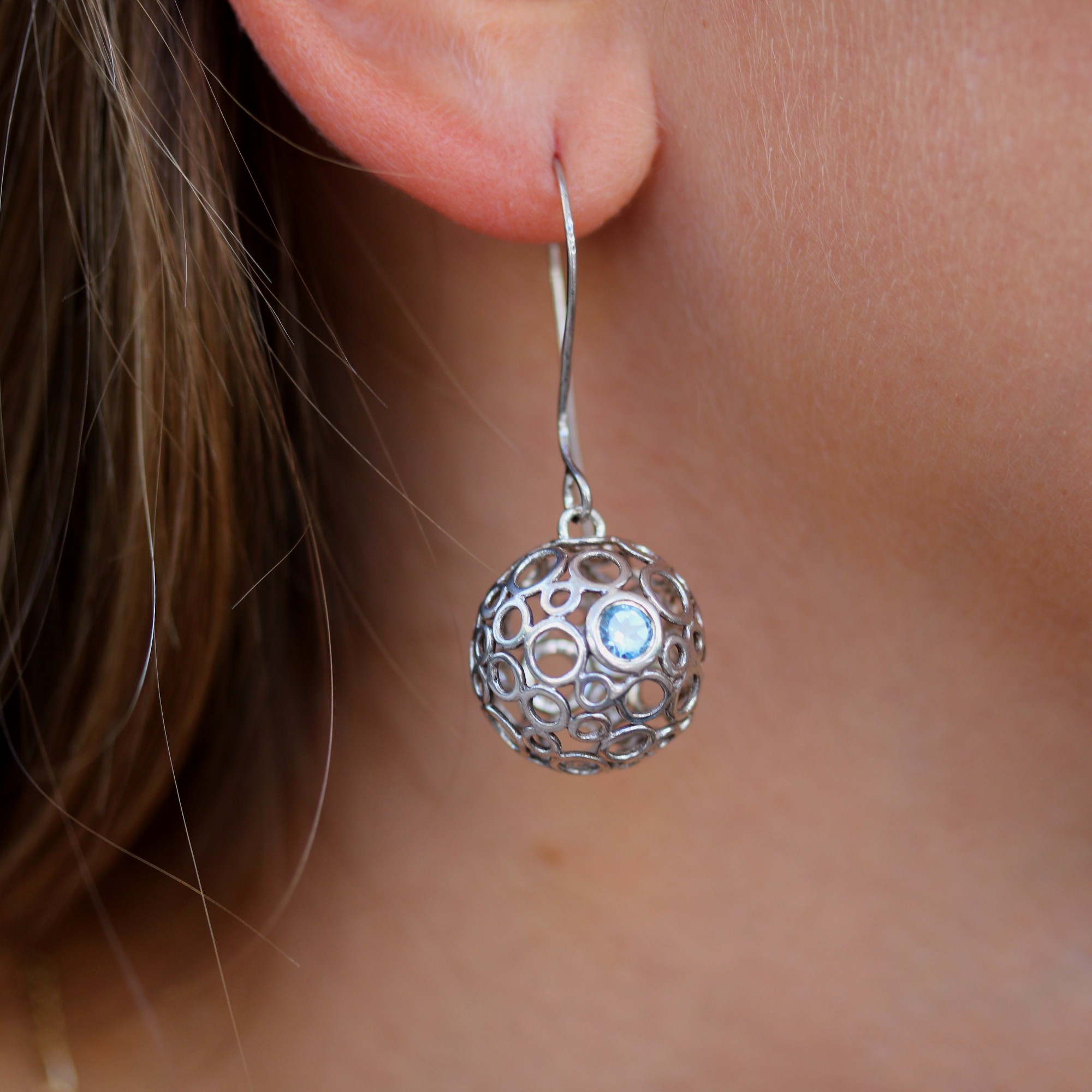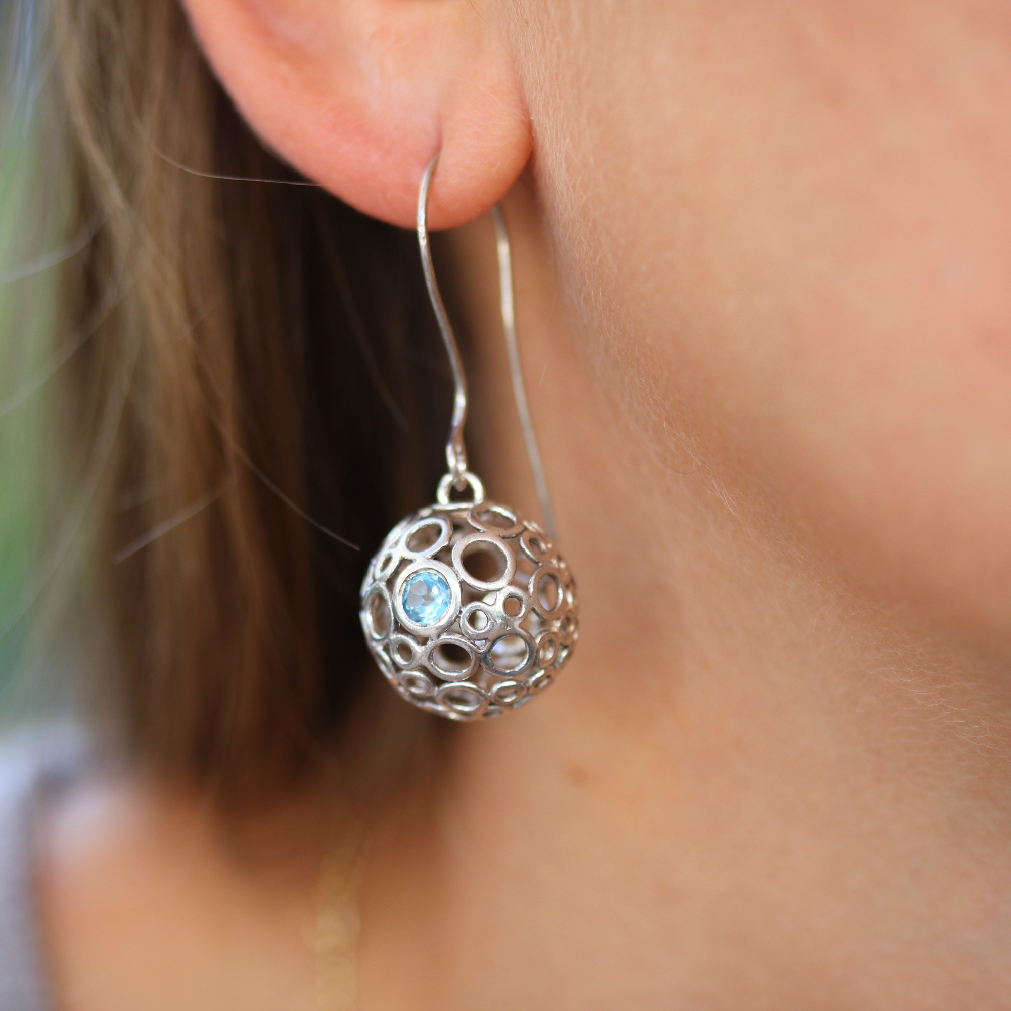 עגילי כדור מכסף בשיבוץ בלו טופז