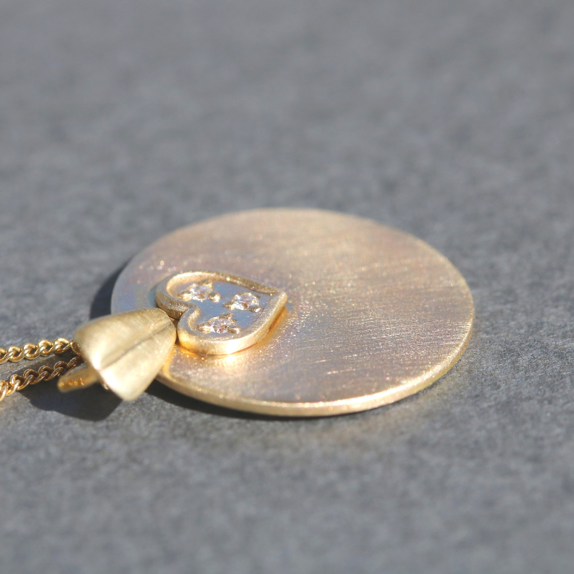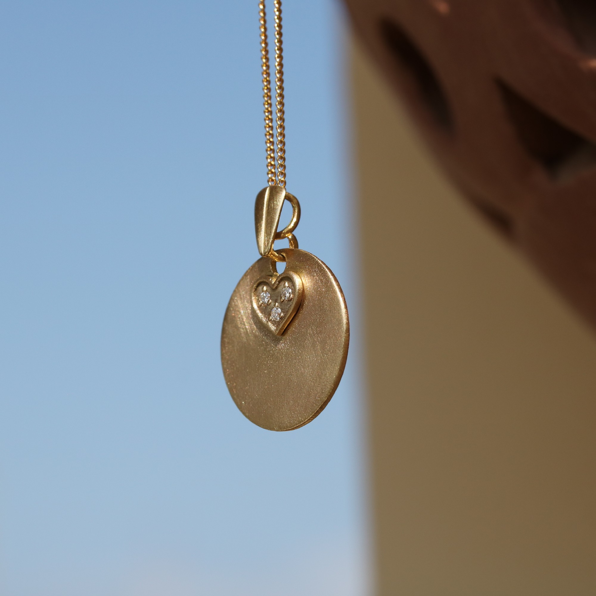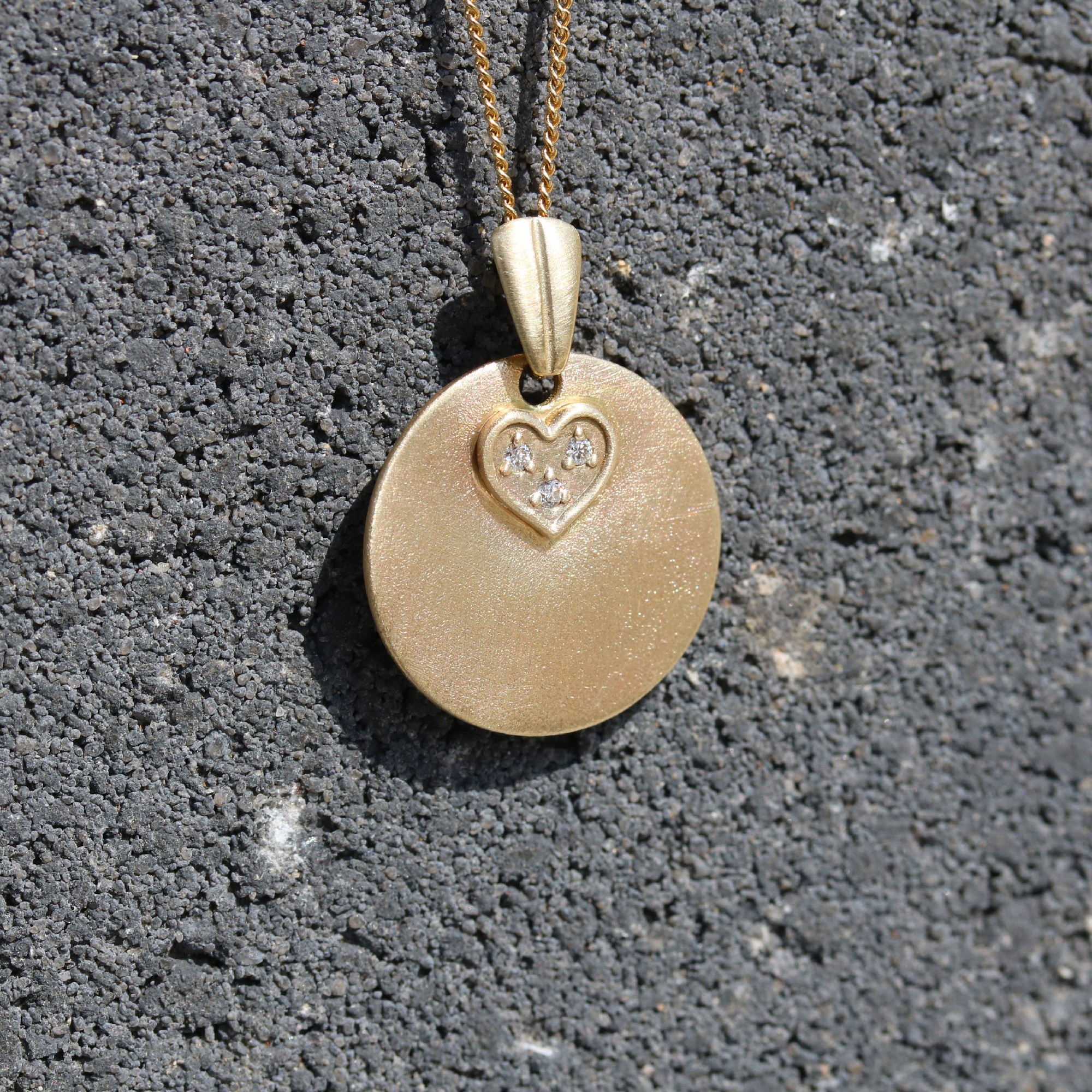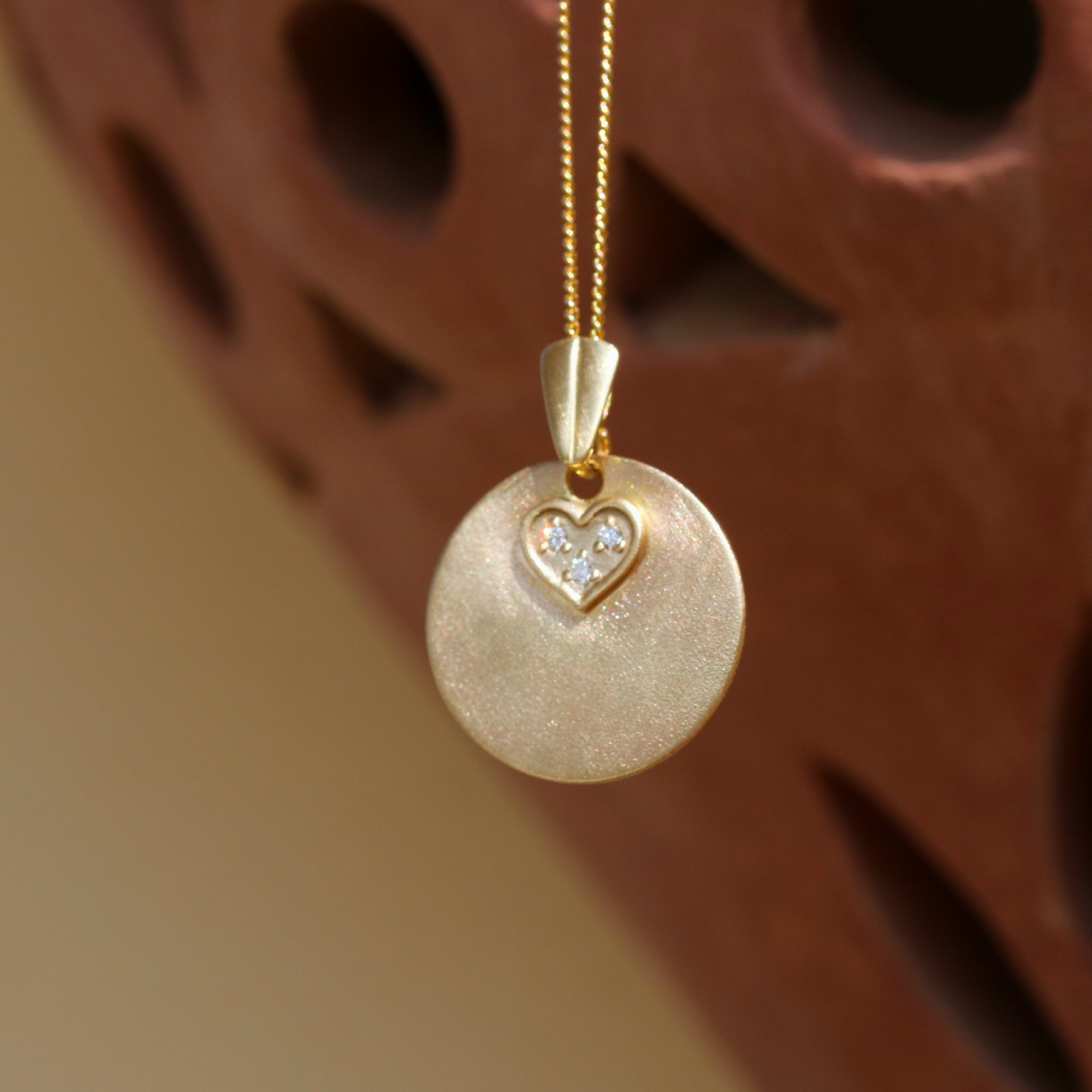 תליון בצורת דיסקית בזהב צהוב 14K עם לב משובץ יהלומים